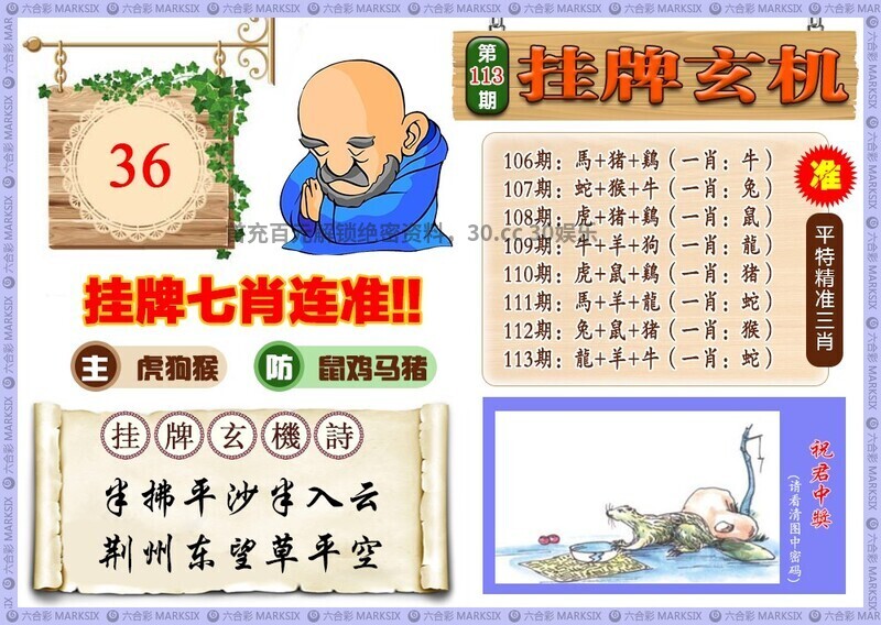 113期正版彩图挂:38爆:马 挂牌成语:变起萧墙 挂牌出肖:猪鸡狗猴羊虎